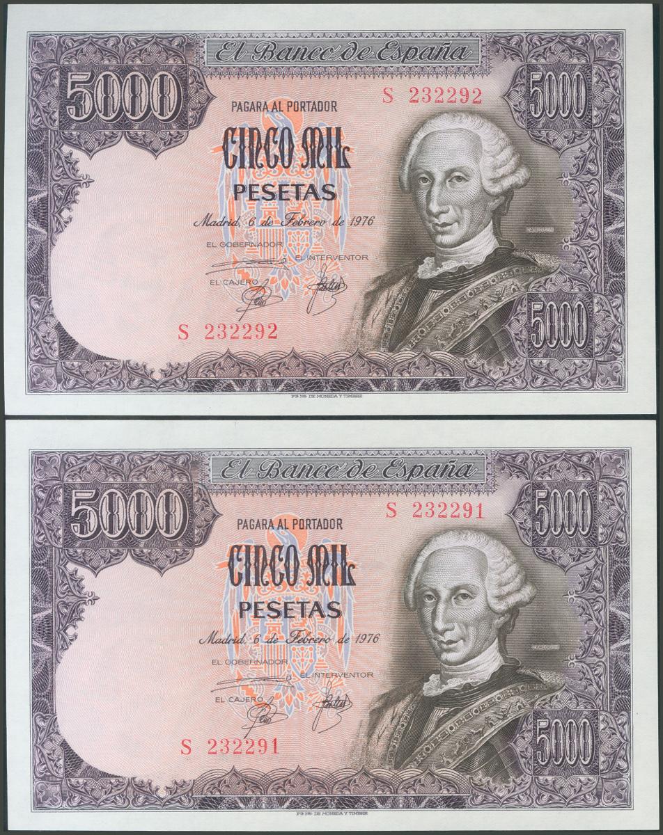 5000 Pesetas. 6 de Febrero de 1976. Pareja correlativa. Serie S. (Edifil 2017: 475a). Apresto original. SC.