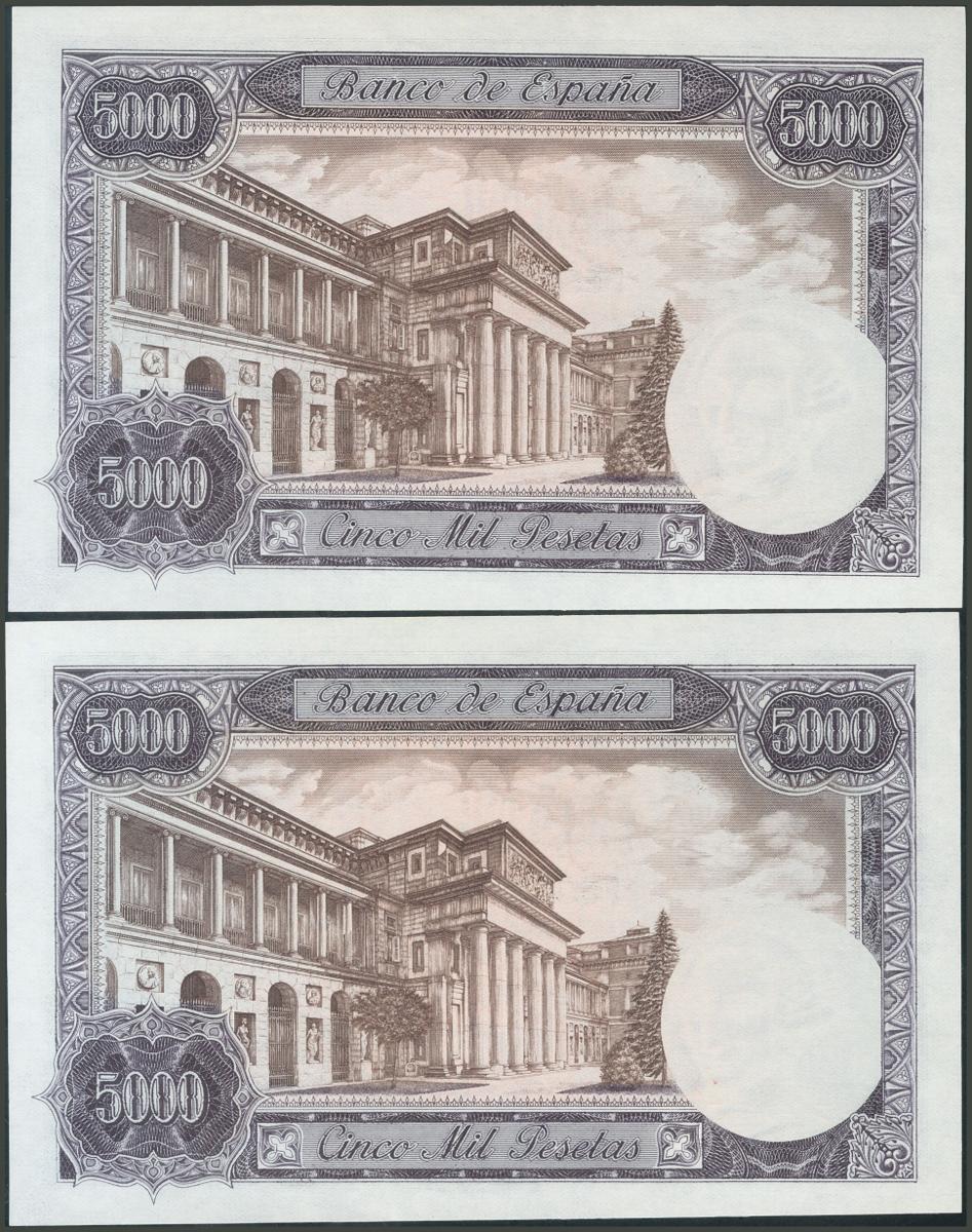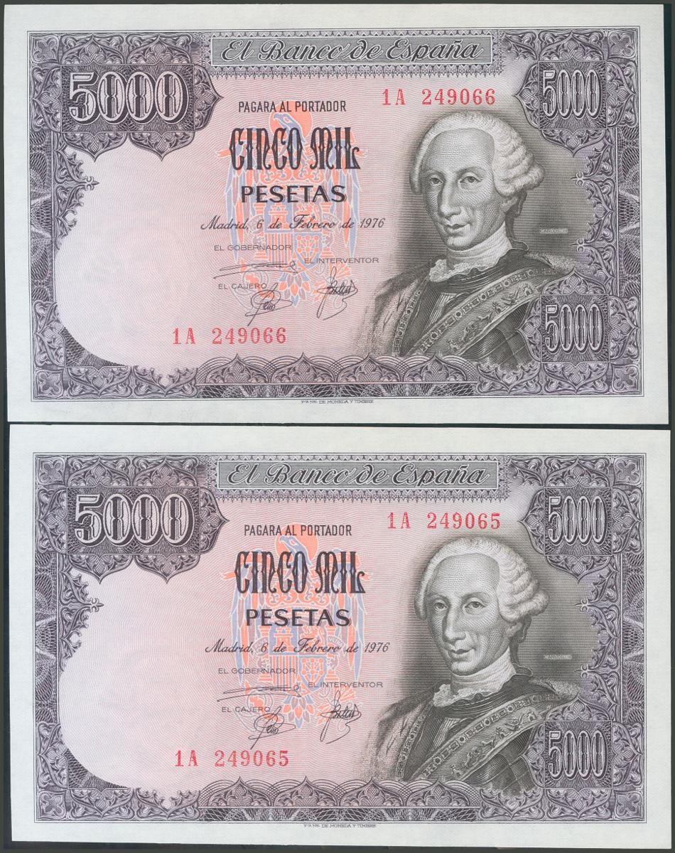 5000 Pesetas. 6 de Febrero de 1976. Pareja correlativa. Serie 1A. (Edifil 2017: 475a). Apresto original. SC.