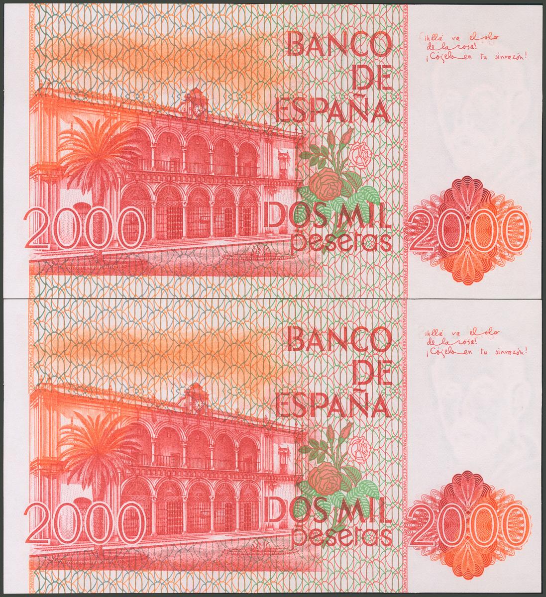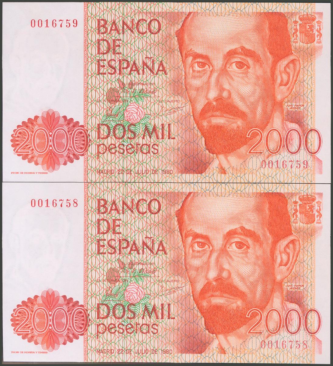 2000 Pesetas. 22 de Julio de 1980. Pareja correlativa. Sin serie y numeración baja. (Edifil 2017: 479). SC/SC-.