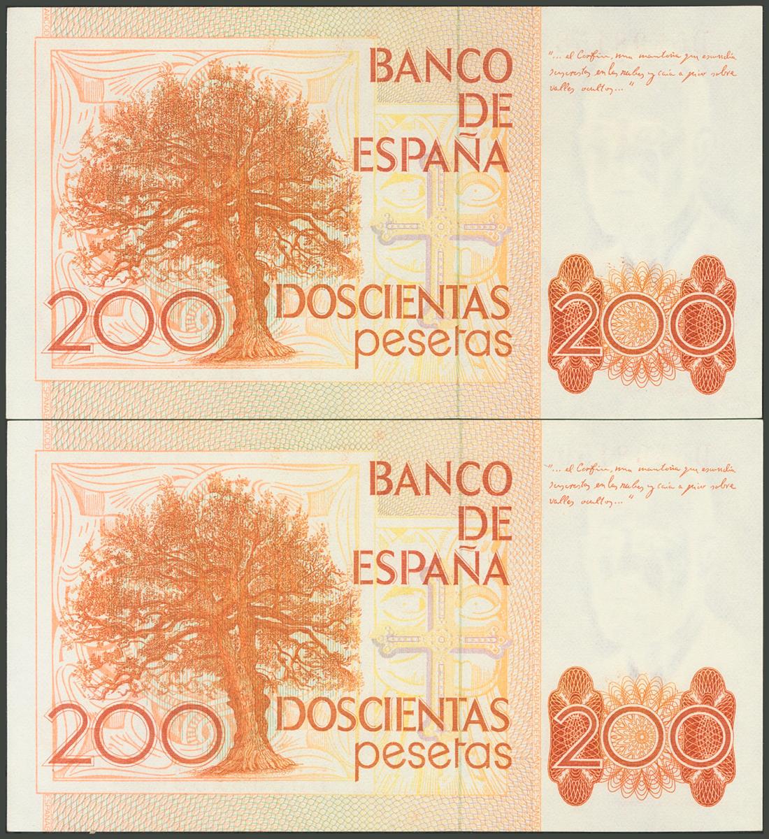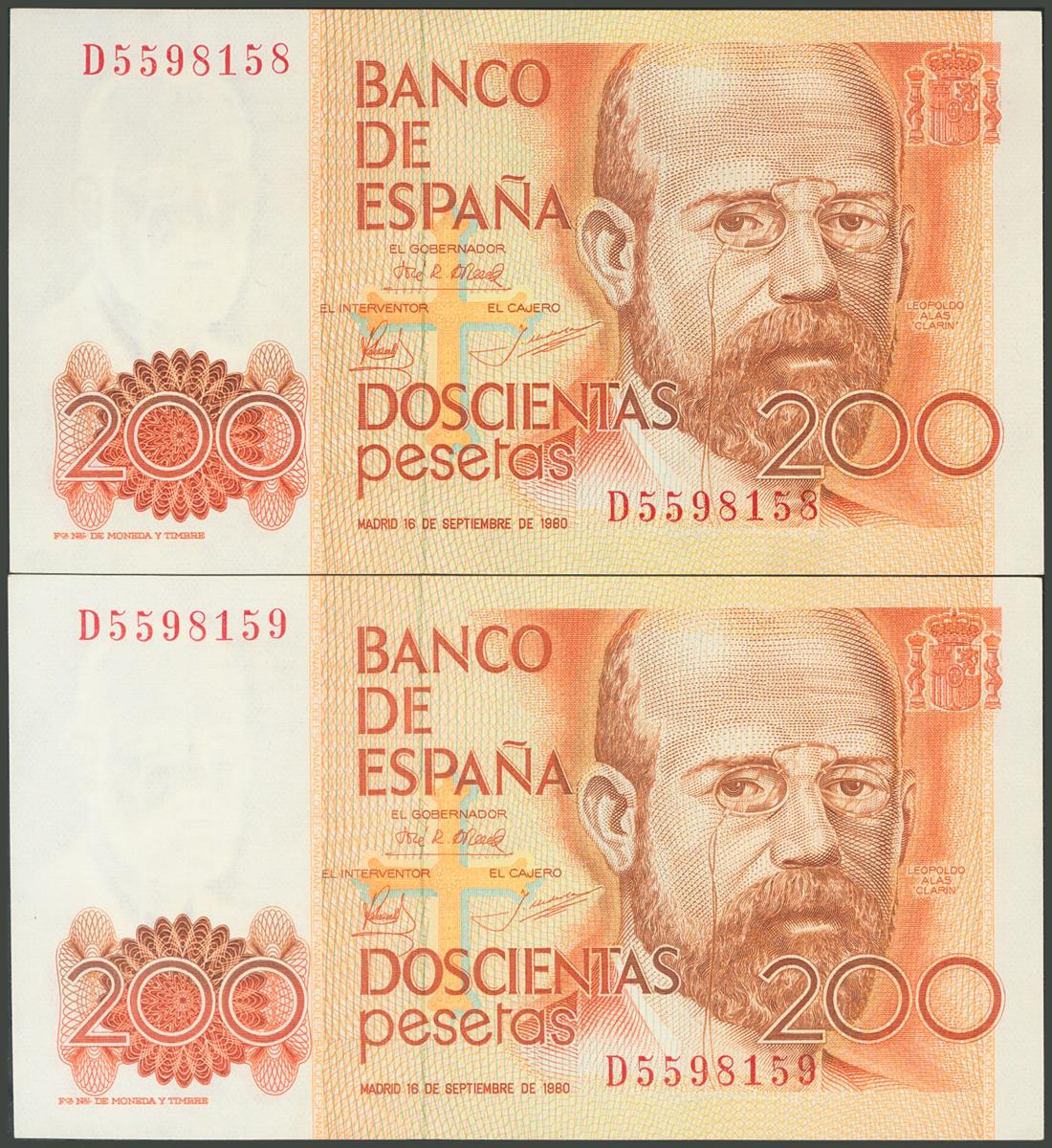 200 Pesetas. 16 de Septiembre de 1980. Pareja correlativa. Serie D. (Edifil 2017: 480a). EBC.