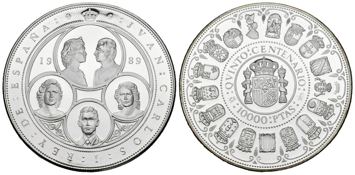 JUAN CARLOS I (1975-2014). 10000 Pesetas. (Ar. 168,75g/73mm). Serie I. Quinto Centenario. 1989. FNMT. Flor de cuño. Tirada de 60 mil unidades. Incluye estuche original y certificado de autenticidad.