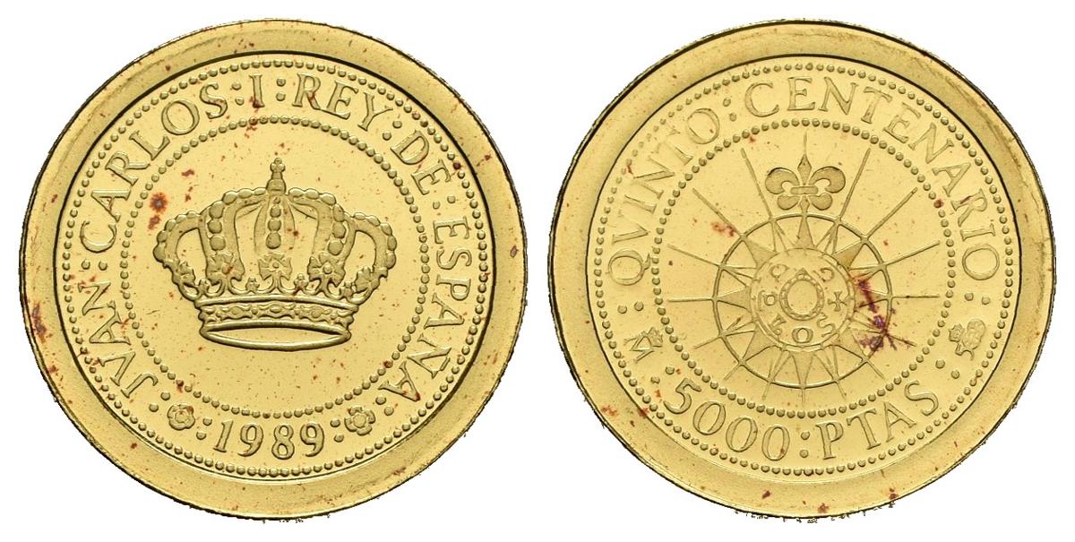 JUAN CARLOS I (1975-2014). 5.000 Pesetas. (Au. 1,68g/15mm). Serie I. Quinto Centenario. 1989. FNMT. Flor de cuño. Canto estriado y liso. Tirada de 32mil unidades. Incluye estuche original y certificado de autenticidad.