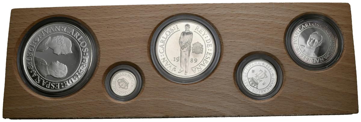 JUAN CARLOS I (1975-2014). Colección de 5 valores de plata emitidos por la FNMT. Valores de 100, 200, 500, 1000 y 2000 Pesetas. Serie I. 1989. Flor de cuño. Tirada de 150 mil unidades. Flor de cuño. Incluye estuche original y certificado de autenticidad.