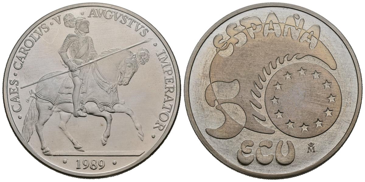 JUAN CARLOS I (1975-2014). 5 Ecu. (Ar. 33,62g/42mm). Carlos V. 1989. FNMT. Flor de cuño. 250.000 acuñaciones. Incluye estuche oficial y certificado de autenticidad.