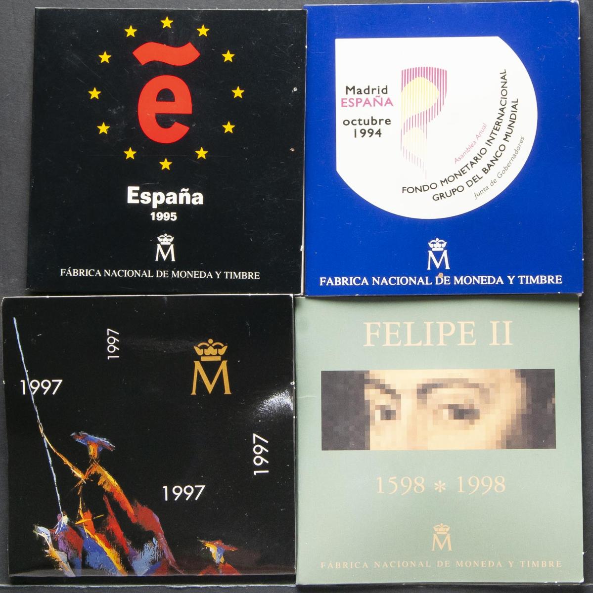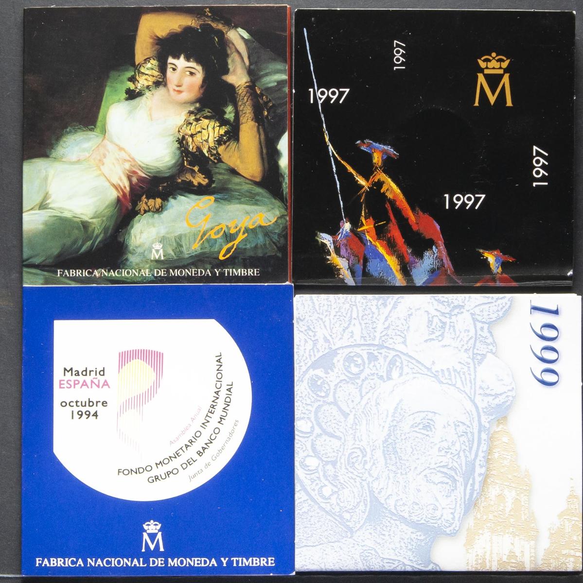 CONTEMPORÁNEO. Conjunto compuesto por 10 sets de 2000 Pesetas con diferente temática: Xacobeo, Goya, Asamblea del FMI, Presidencia Española de la Unión Europea, Felipe II y El Quijote. Acuñaciones comprendidas entre 1994 y 1999. Magnífico estado de conservación. A EXAMINAR.