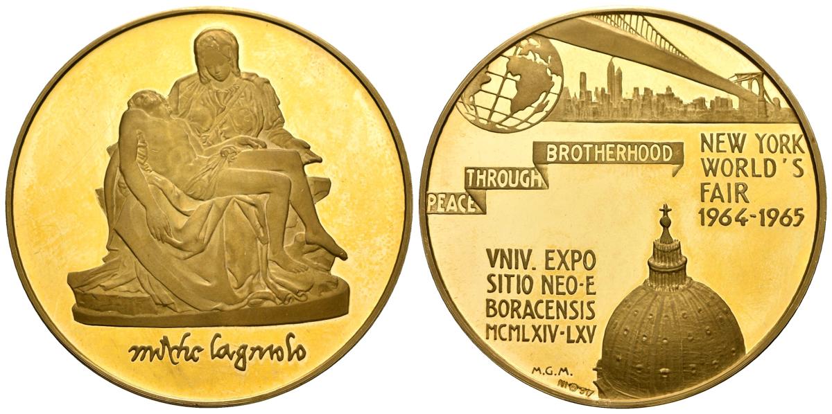 CONTEMPORÁNEO, Numismática Ibérica. Feria Mundial de Nueva York 1964-1965. (Au. 35,13g/45mm). Piedad de Miguel Ángel en anverso. SC. Incluye estuche original y certificado de autenticidad.