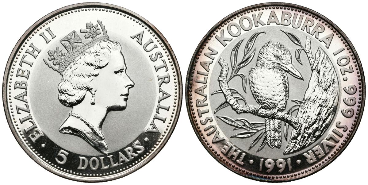 AUSTRALIA. 5 Dollars (Ar. 31,32g/40mm). 1991. Kookaburra. (Km#138). Proof.