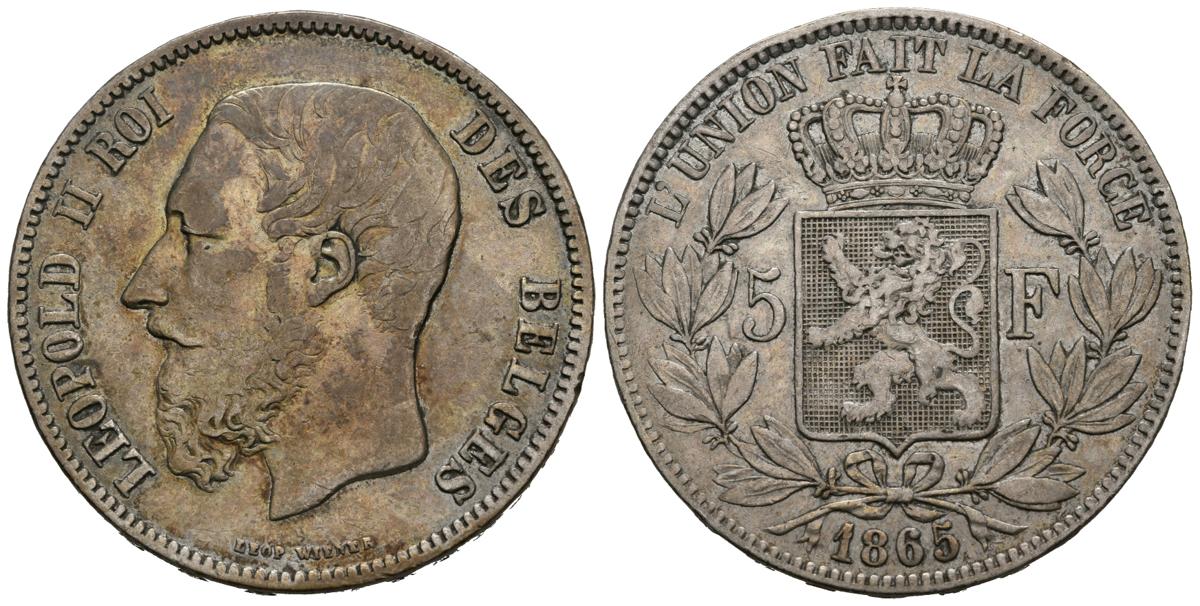 BÉLGICA. 5 Francs (Ar. 24,74g/37mm). 1865. Leopoldo II. (Km#24). MBC. Bonita pátina en anverso. Escasa.