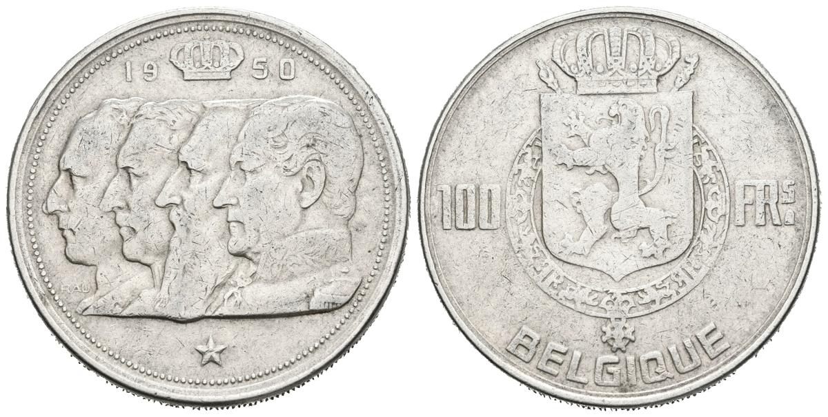 BÉLGICA. 100 Francs (Ar. 18.13g/33mm). 1950. Belgique en francés.(Km#138.1). MBC+.
