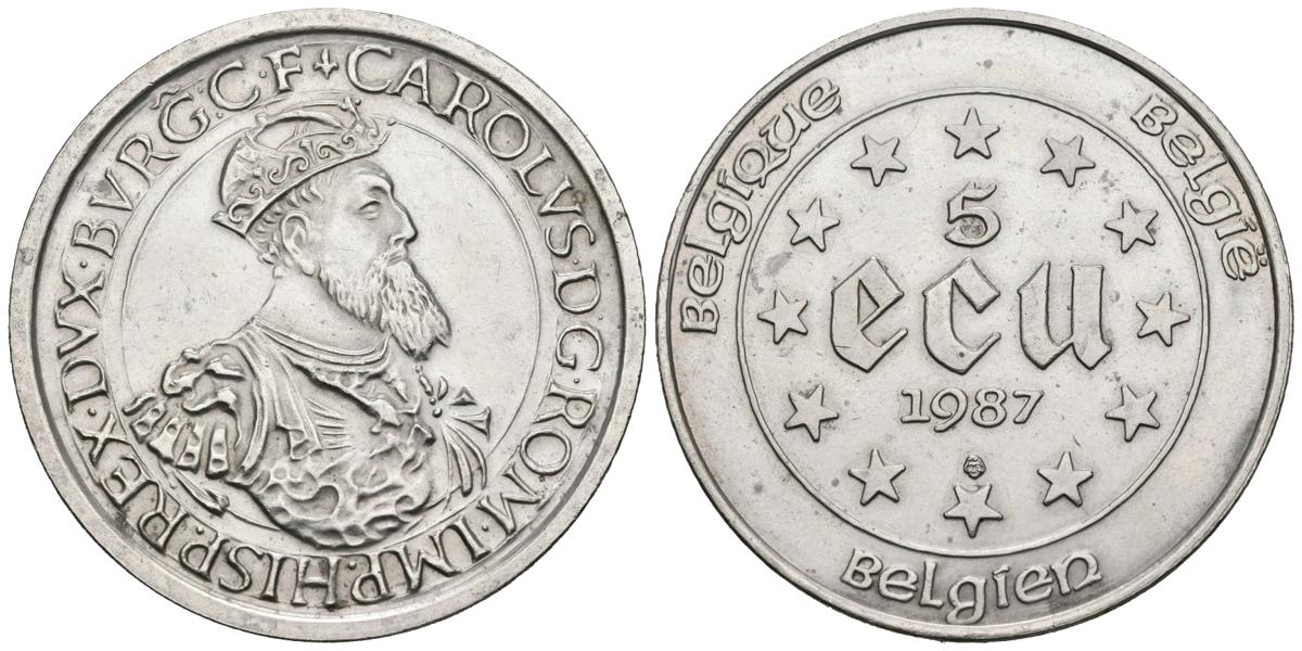 BELGICA. 5 Ecu. (Ar. 22,89g/37mm). 1987. Carlos V. (Km#166). EBC.