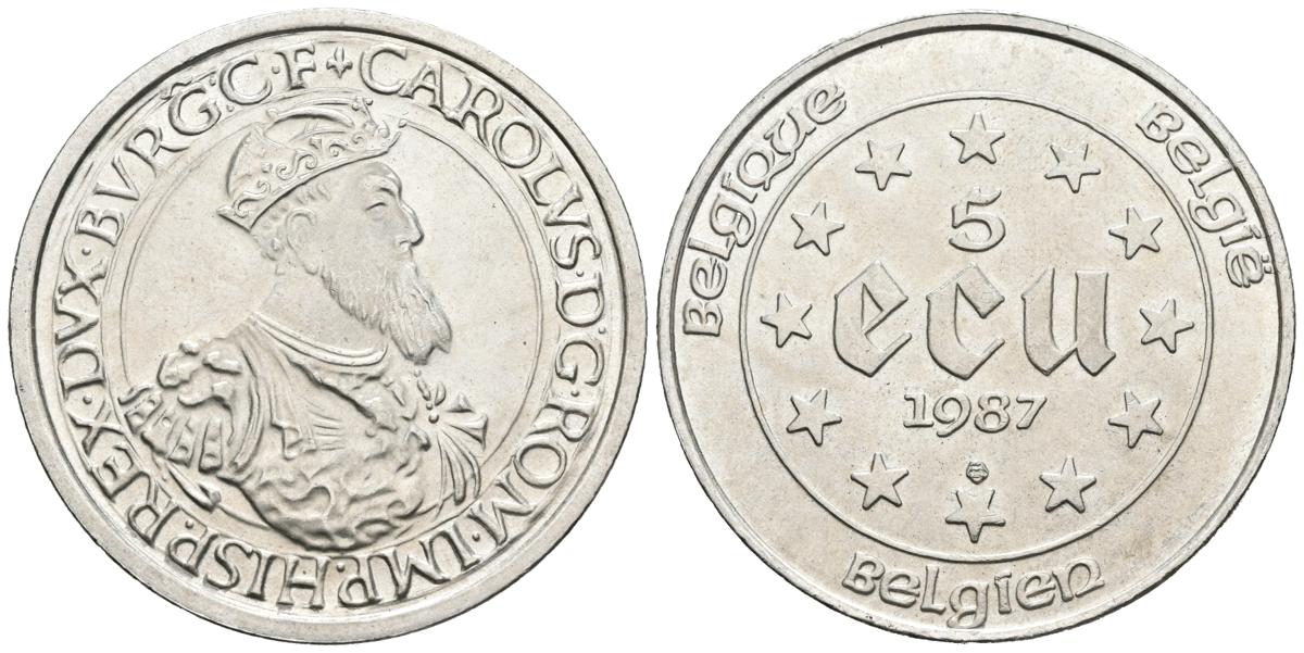BELGICA. 5 Ecu (Ar. 22,71g/37mm). 1987. Carlos V. (Km#166). EBC+. Brillo original.