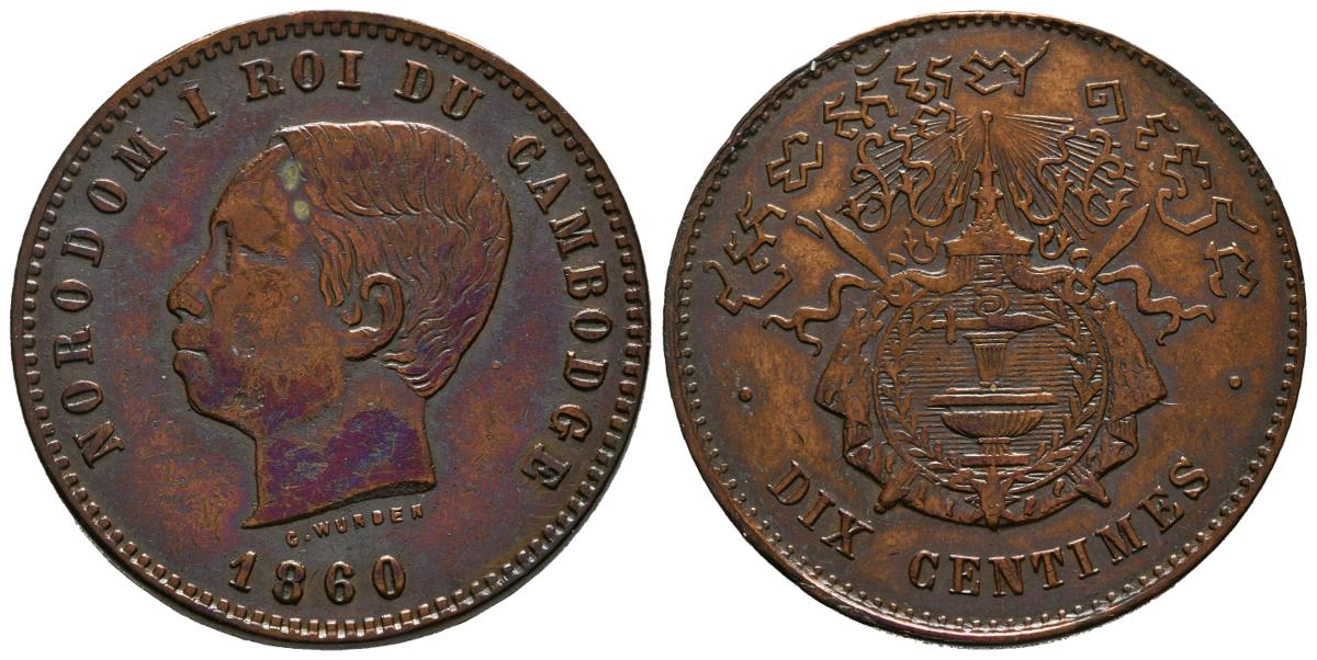 CAMBOYA. 10 Céntimos (Ae. 10,69g/30mm). 1860. Norodom I. (Km#43). MBC. Bonita pátina.