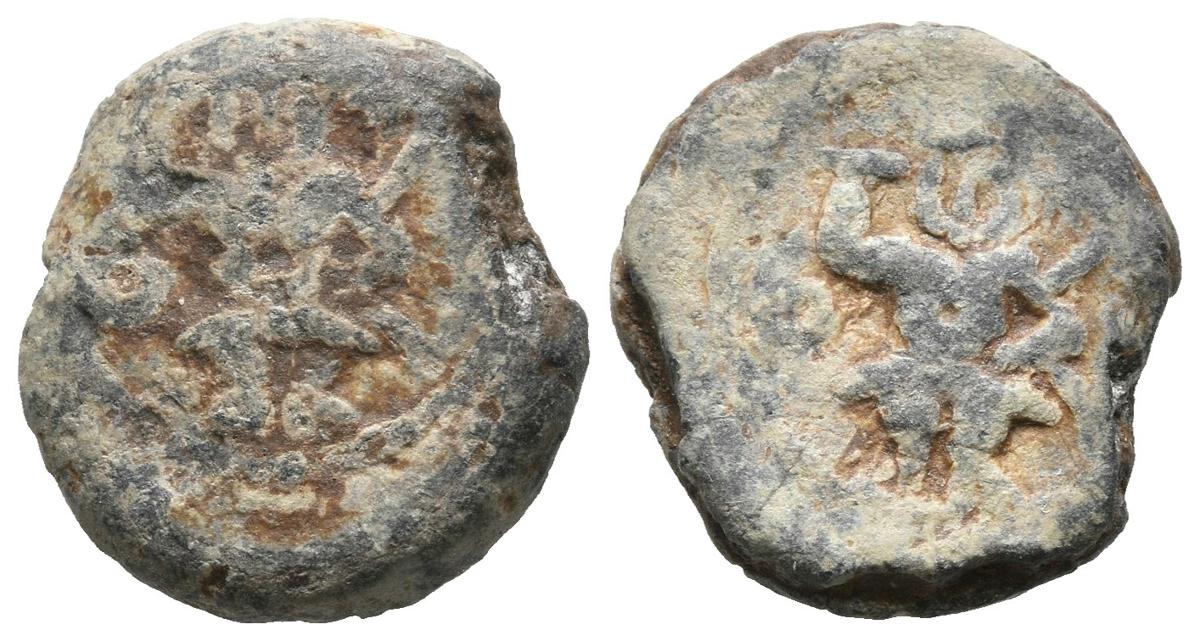 EBUSUS (Ibiza). Plomo monetiforme. (Pb. 4,16g/14mm). Anv: Bes de frente con faldellín, martillo y serpiente. Rev: Bes de frente con faldellín, martillo y serpiente. MBC-. Escaso.