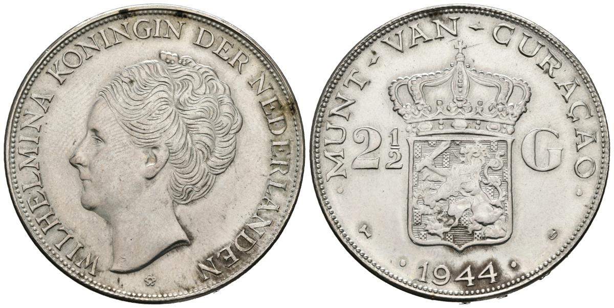 CURACAO (Colonia Holandesa). 2 1/2 Gulden (Ar. 25,04g/33mm). 1944. Guillermina. Denver D. (Km#46). EBC. Bonita pátina.
