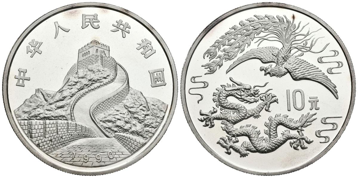 CHINA. 10 Yuan (Ar. 31,23g/40mm). 1990. Gran Muralla China. Phoenix y Dragón. (Km#261). PROOF.