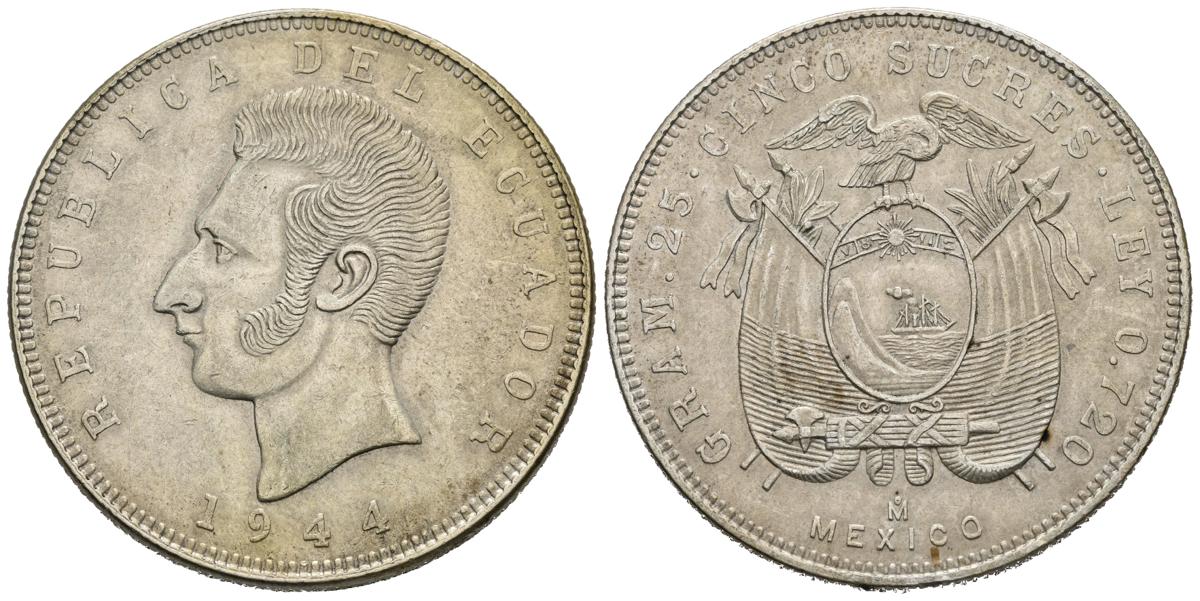 ECUADOR. 5 Sucres. (Ar. 24,93g/38mm). 1944. Acuñada en México. (Km#79). EBC-.