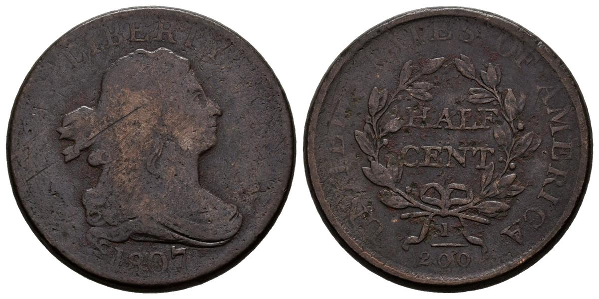 ESTADOS UNIDOS. 1/2 Centavo (Ae. 5,50g/23mm). 1807. Philadelphia. Busto drapeado. (Km#33). BC-. Escasa.