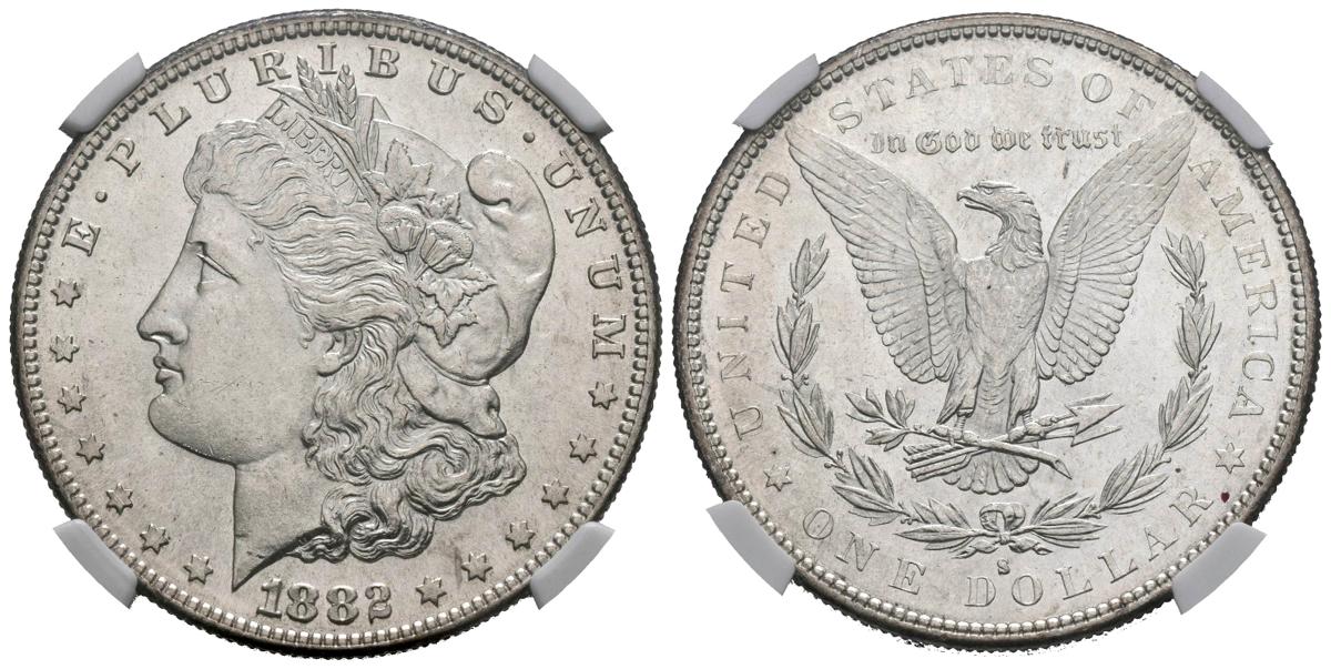 ESTADOS UNIDOS. 1 Dollar (Ar. 27,00g/38mm)*. 1882. San Francisco. (Km#110). MS62. Encapsulada por NGC. *Pesos y medidas teóricos.