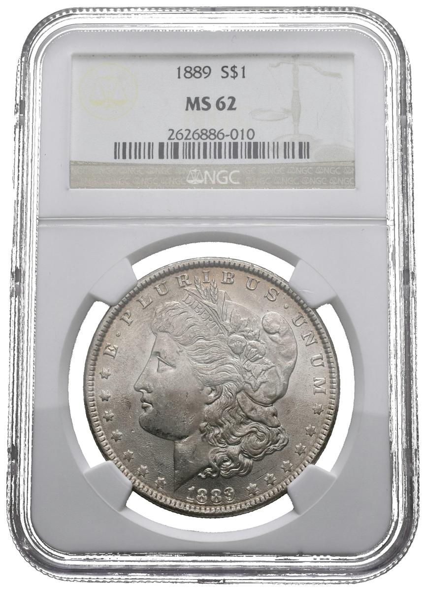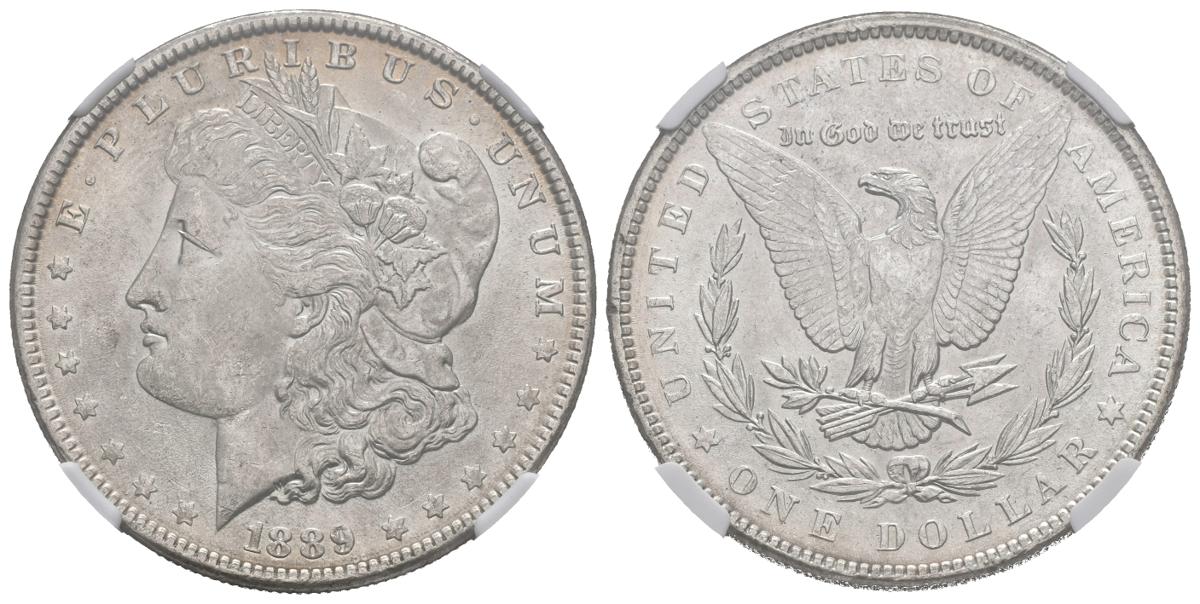 ESTADOS UNIDOS. 1 Dollar (Ar. 27,00g/38mm)*. 1889. Philadelphia. (Km#110). MS62. Encapsulada por NGC. *Pesos y medidas teóricos.