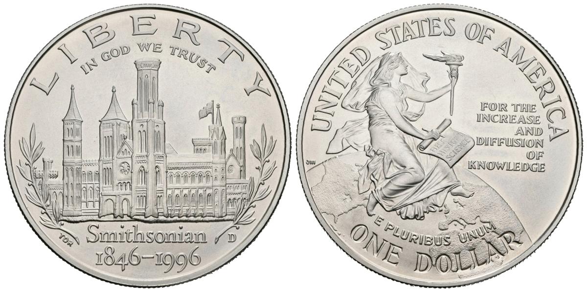 ESTADOS UNIDOS. 1 Dollar (Ar. 26,62g/38mm). 1996. Denver. 150 Aniversario de la Institución de Smithsonian (Km#276). SC. Escasa. Tirada de sólo 31.230 unidades.