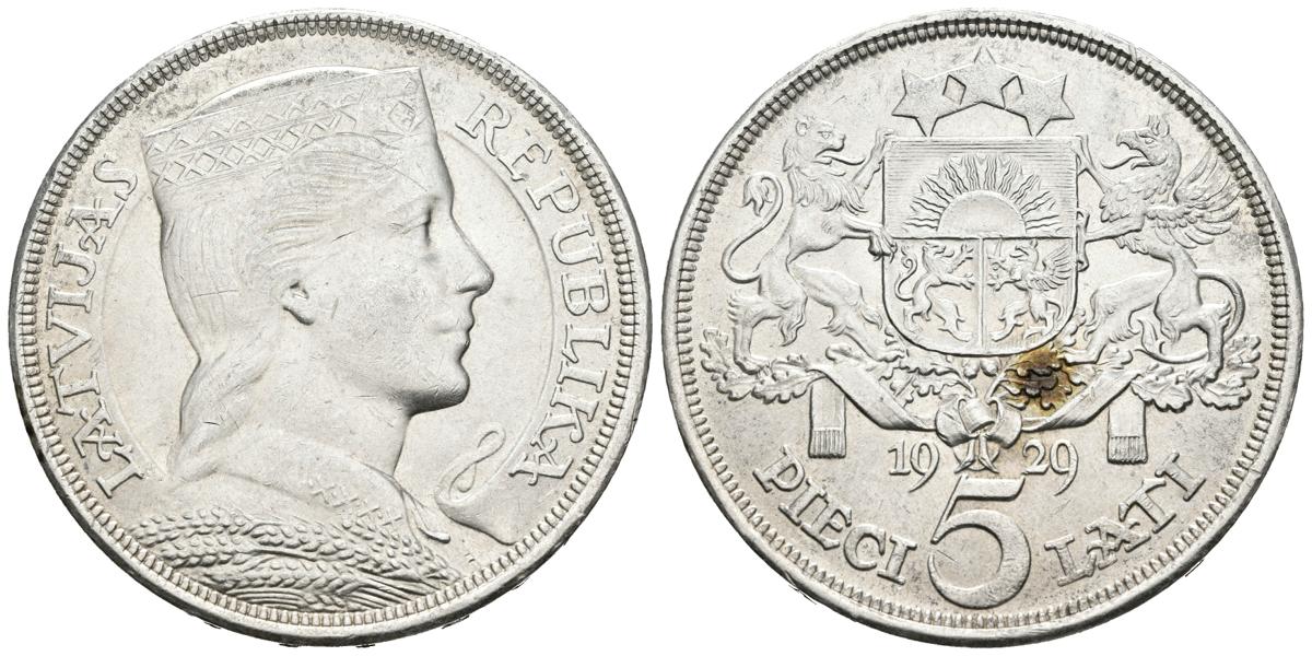LETONIA. 5 Lati. (Ar. 25,04g/37mm). 1929. 1ª República. (Km#9). MBC+/EBC-.