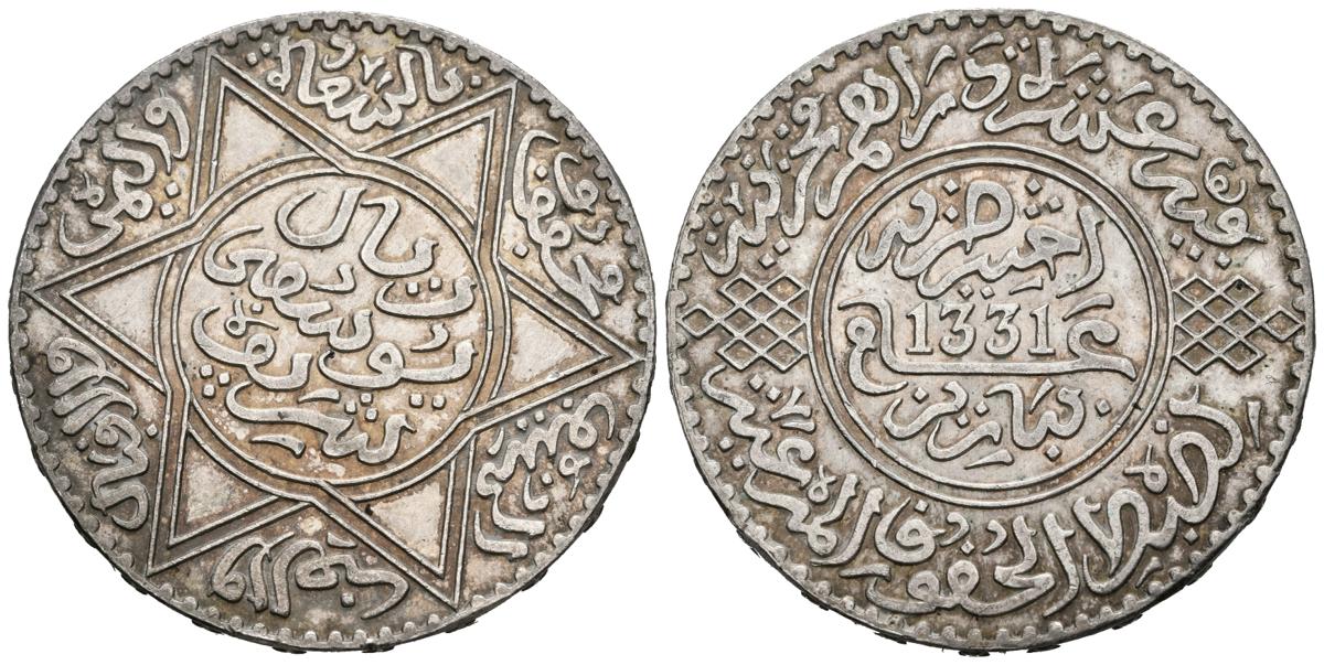 MARRUECOS. 10 Dirhams (Ar. 24,97g/37mm). 1331 H (1913). Protectorado Francés. París. (Km#33). EBC. Preciosa pátina.