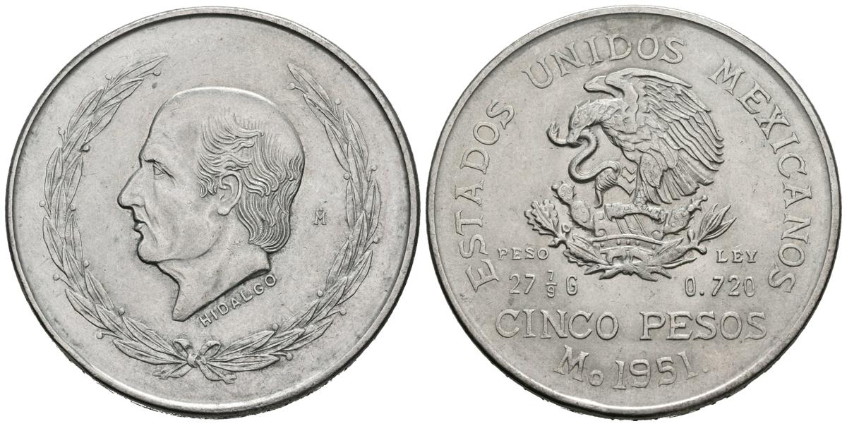 MÉXICO. 5 Pesos (Ar. 27,74g/40mm). 1951. Hidalgo. (Km#467). EBC-.