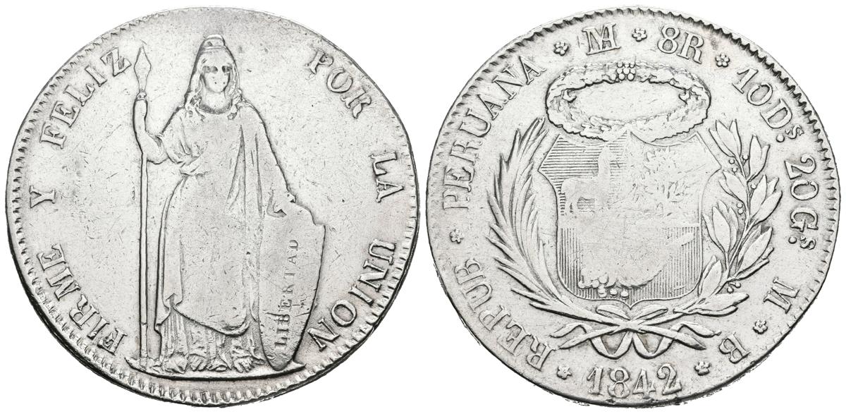 PERÚ. 8 Reales (Ar. 25,93g/39mm). 1842. Lima MB. (Km#142.10). BC+. Vanos de acuñación.