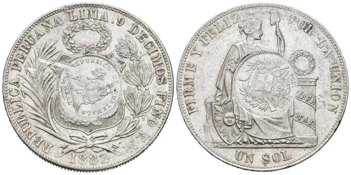 PERÚ. 1 Sol (Ar. 24,98g/38mm). 1882. Lima FN. Resellada a 1/2 Real en 1894. (Km#196.15); (Km#165 en 1/2 Real). EBC. Leves marquitas.