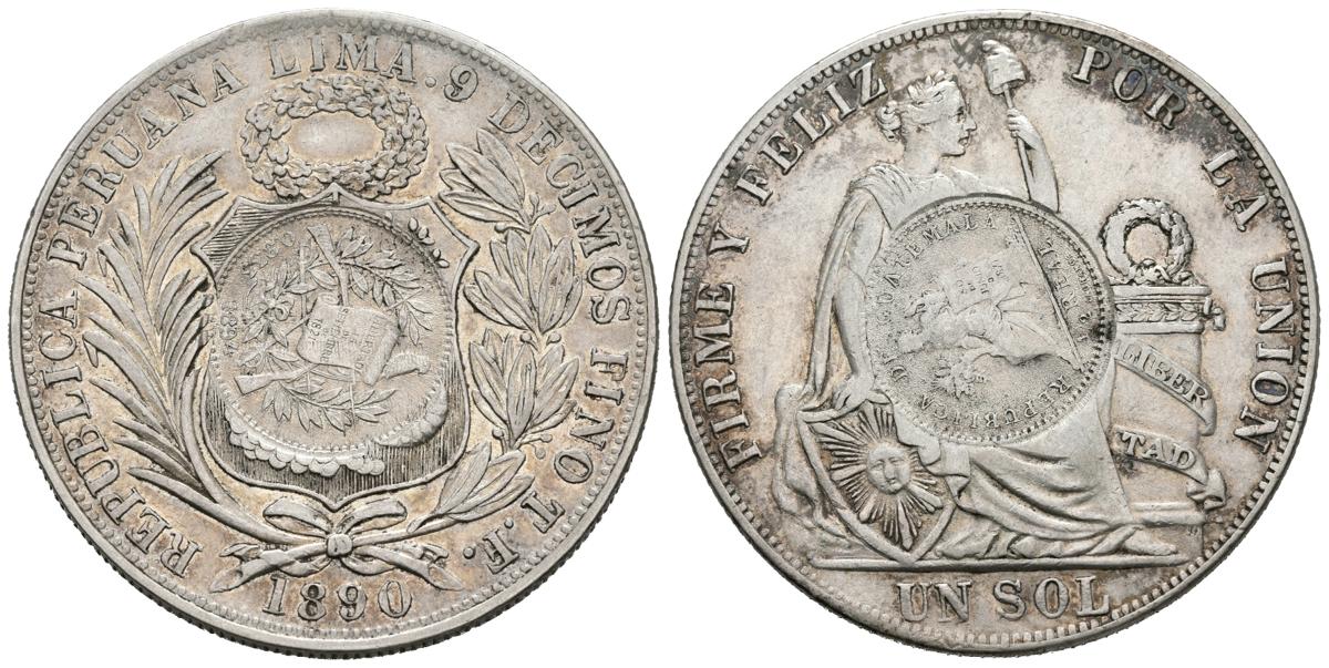 PERÚ. 1 Sol (Ar. 24,95g/38mm). 1890. Lima TF. Resellada a 1/2 Real en 1894. (Km#196.24); (Km#165 en 1/2 Real). MBC+.