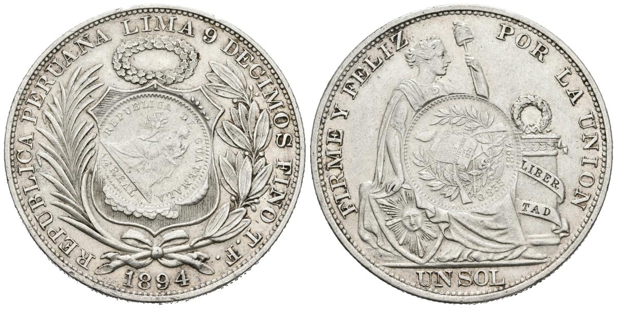 PERÚ. 1 Sol (Ar. 24,99g/38mm). 1894. Lima TF. Resellada a 1/2 Real en 1894. (Km#196.26); (Km#165 en 1/2 Real). EBC.