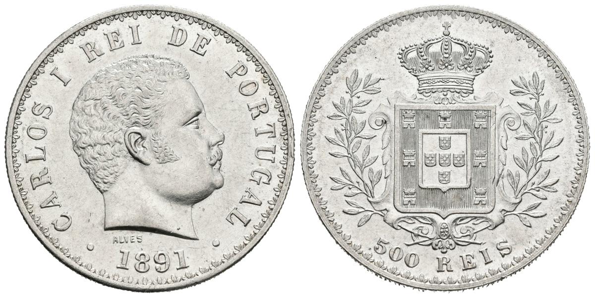 PORTUGAL. 500 Reis. (Ar. 12,65g/30mm). 1891. D. Carlos I. (Km#535). EBC.