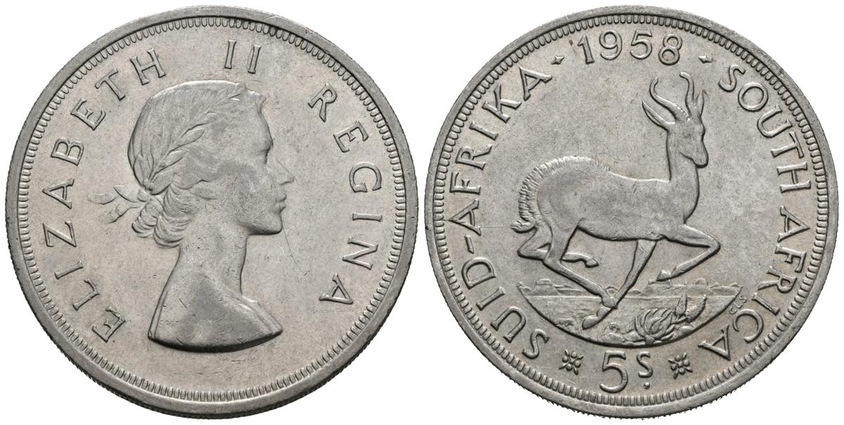 SUDÁFRICA. 5 Shillings. (Ar. 28.41g/38mm). 1958. Elizabeth II. (Km#52). MBC+