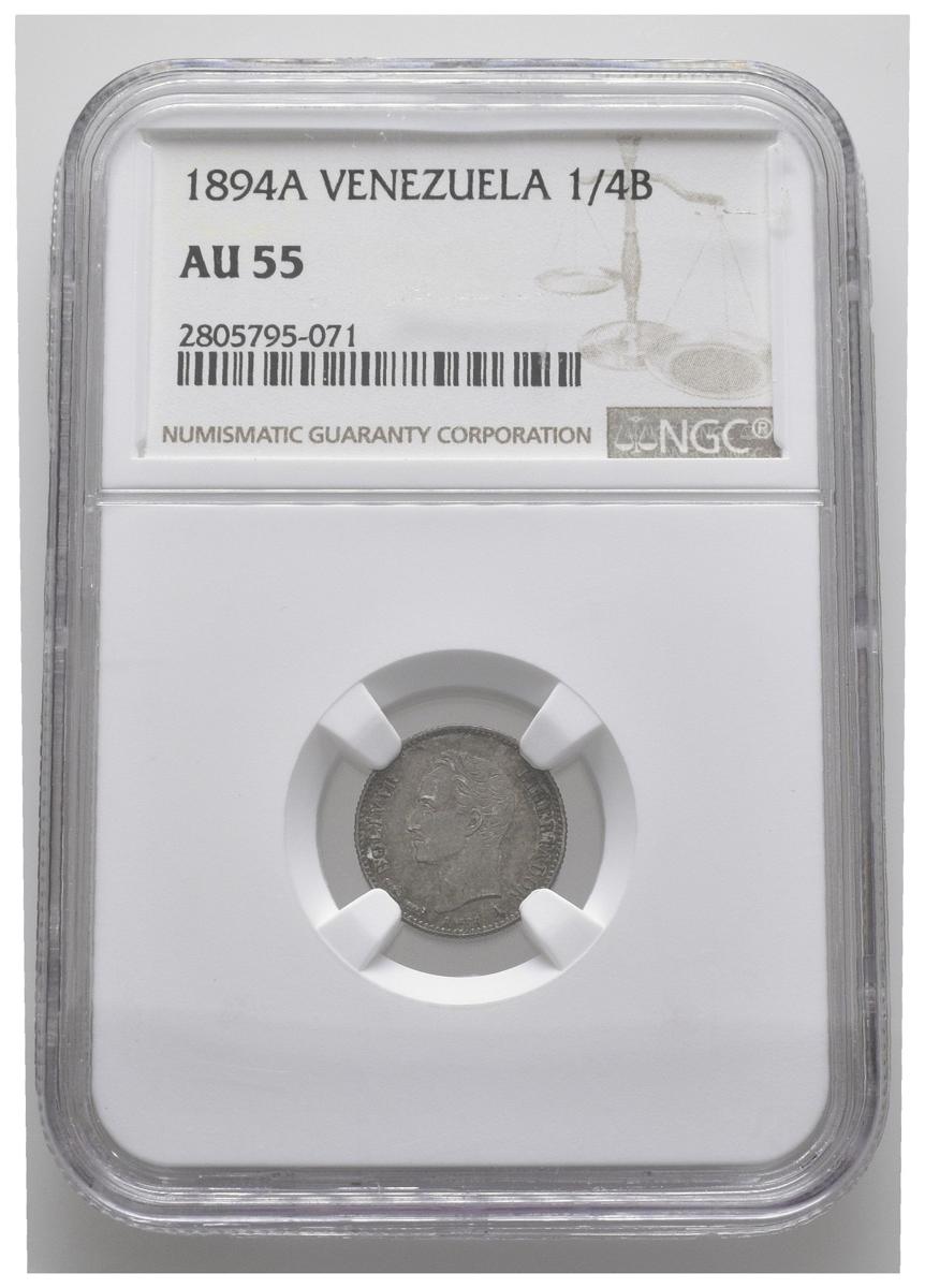 ESTADOS UNIDOS DE VENEZUELA. 1/4 Bolívar. (Ar. 1,25g/15mm). 1894. París A. (Km#Y20). Encapsulado NGC AU-55.