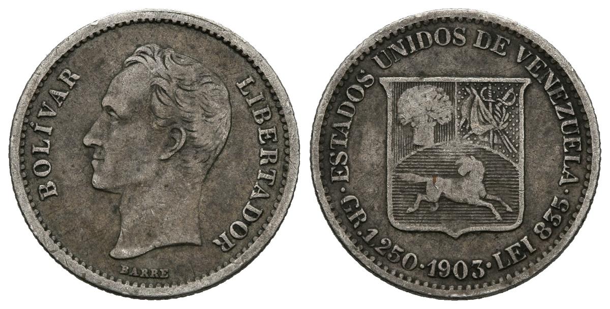 ESTADOS UNIDOS DE VENEZUELA. 1/4 Bolívar. (Ar. 1,25/15mm). 1903. (Km#Y20). MBC+. Preciosa pátina.
