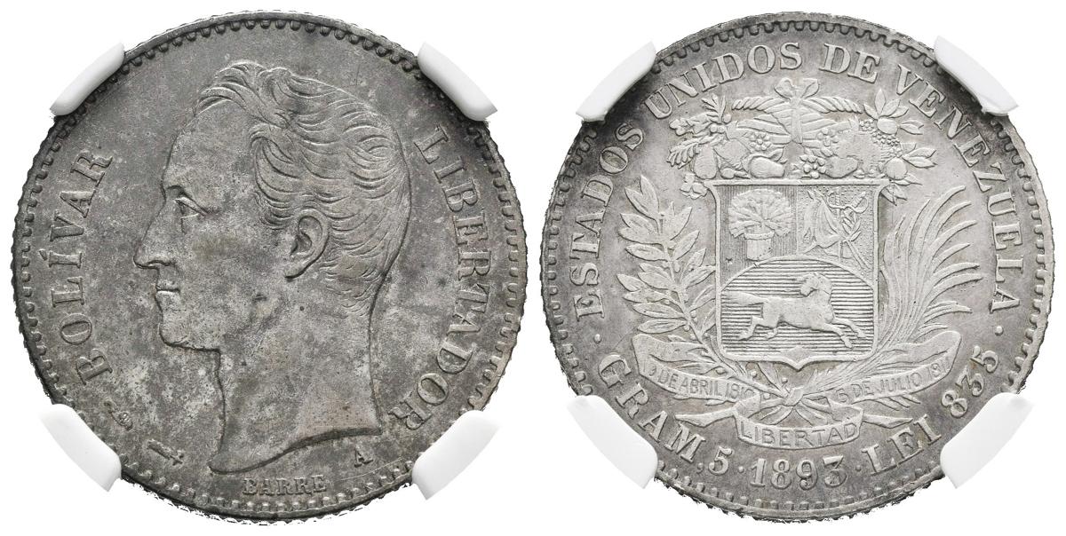 ESTADOS UNIDOS DE VENEZUELA. 1 Bolívar. (Ar. 5,00g/23mm). 1893. París A. (Km#Y22). Encapsulado NGC VF Details. Rayitas.