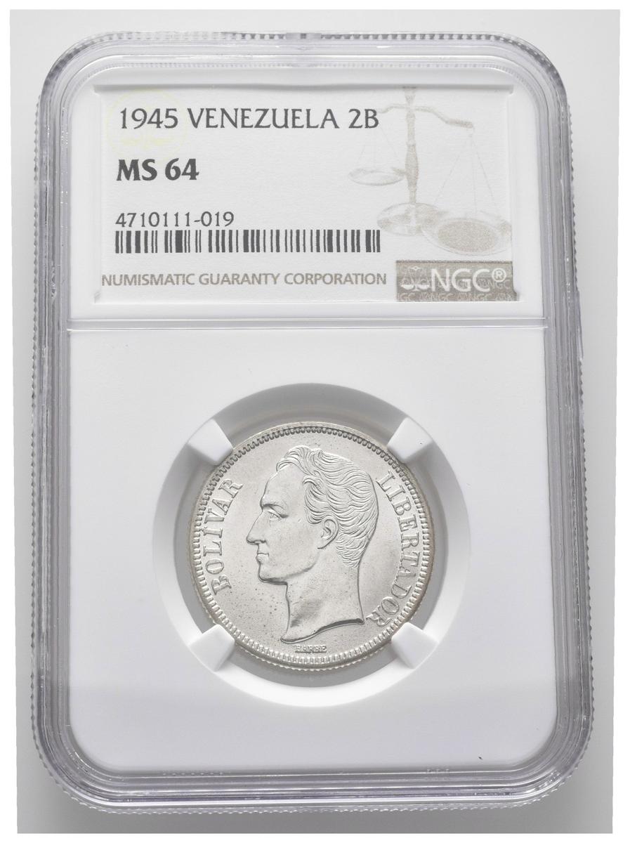 ESTADOS UNIDOS DE VENEZUELA. 2 Bolívares (Ar. 10,00g/27mm). 1945. Philadelphia. (Km#Y23a). Encapsulado NGC MS-64.
