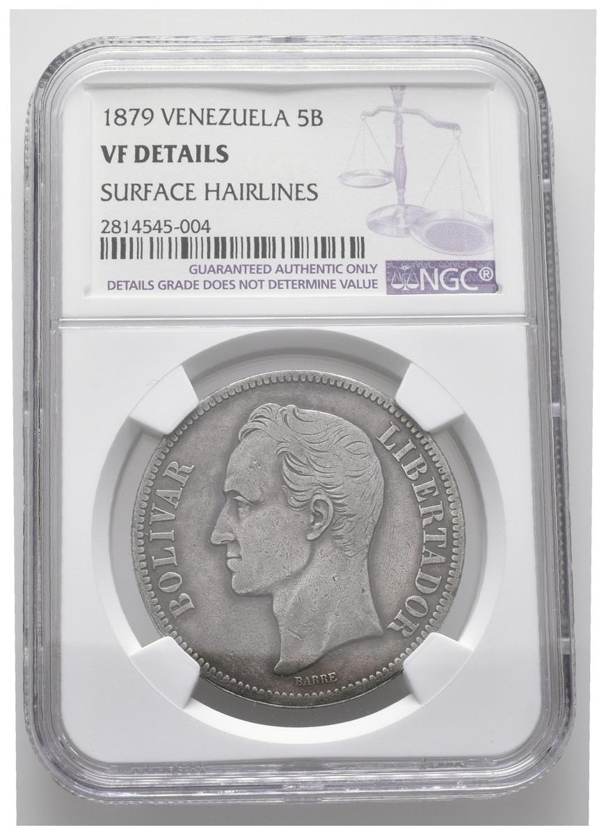 ESTADOS UNIDOS DE VENEZUELA. 5 Bolívares. (Ar. 25,00g/37mm). 1879. Bruselas. (Km#Y24.1). Encapsulado NGC VF Detail. Rayitas.