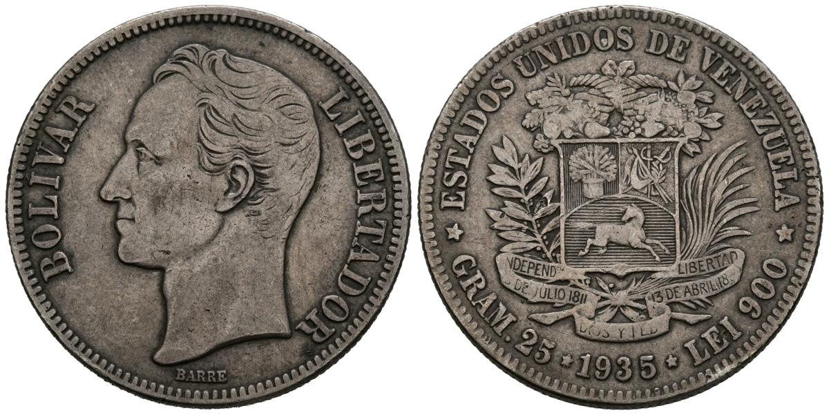 ESTADOS UNIDOS DE VENEZUELA. 5 Bolívares. (Ar. 24,76g/37mm). 1935. Philadelphia. (Km#Y24.2). MBC+.