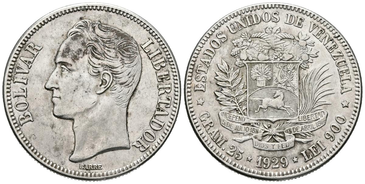 ESTADOS UNIDOS DE VENEZUELA. 5 Bolívares. (Ar. 25,00g/37mm). 1929. Philadelphia. (Km#Y24.2). MBC/MBC+.