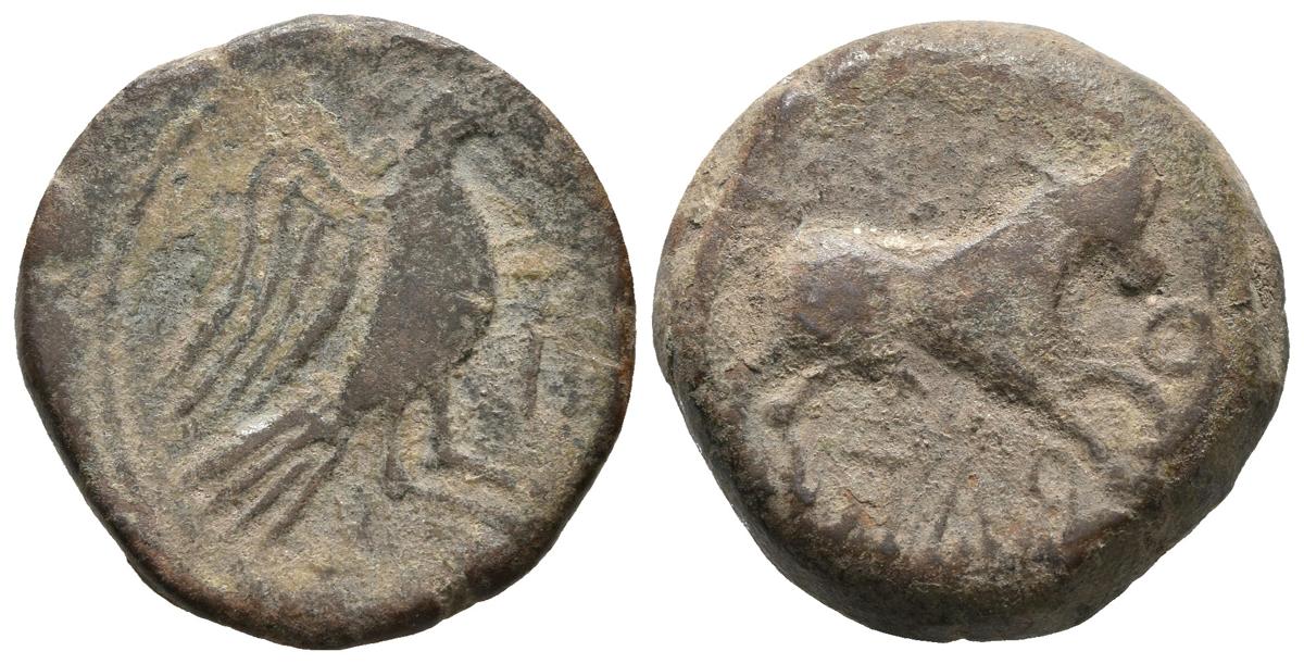OBULCO (Porcuna, Jaén). Semis. (Ae. 8,45g/21mm). 220-20 a.C. (FAB-1850). Anv: Aguila a derecha. Rev: Toro a derecha, debajo leyenda retrógada: OBVLCO. MBC.