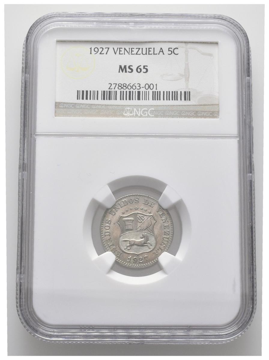ESTADOS UNIDOS DE VENEZUELA. 5 Céntimos. (CuNi. 2,30g/19mm). 1927. Philadelphia. (Km#Y27). Encapsulado NGC MS-65.