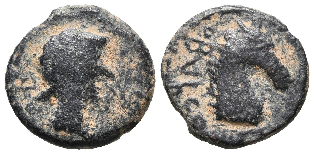 OBULCO (Porcuna, Jaén). Cuadrante. (Ae. 2,90g/15mm). 220-20 a.C. (FAB-1856). Anv: Cabeza de Apolo a derecha. Rev: Cabeza de caballo a derecha, detrás leyenda: OBVLCO. MBC-.