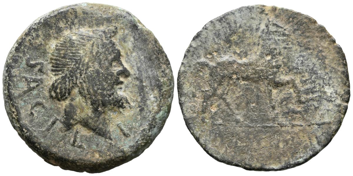 SACILI (Pedro Abad, Córdoba). As. (Ae. 14,86g/33mm). 120-50 a.C. (FAB-2019). Anv: Cabeza masculina barbada a derecha, detrás leyenda: SACILI. Rev: Caballo al paso a derecha. MBC/MBC-. Escaso.
