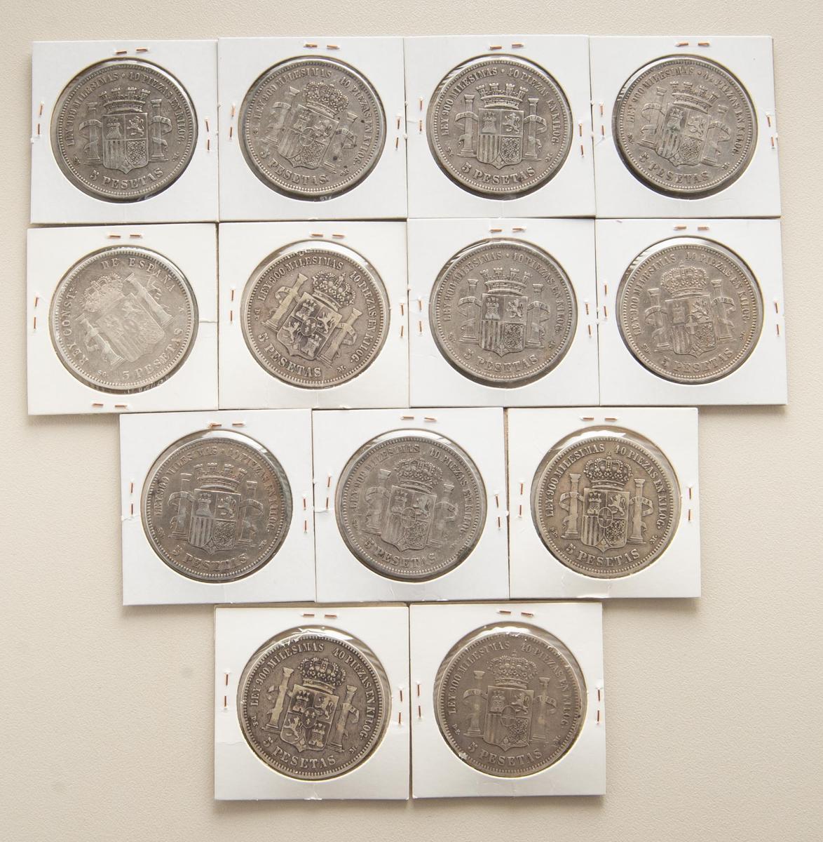 CENTENARIO DE LA PESETA. Bonito conjunto formado por 13 monedas de plata de 5 Pesetas de periodos comprendidos entre el Gobierno Provisional y Alfonso XIII. Diferentes estados de conservación. A EXAMINAR
