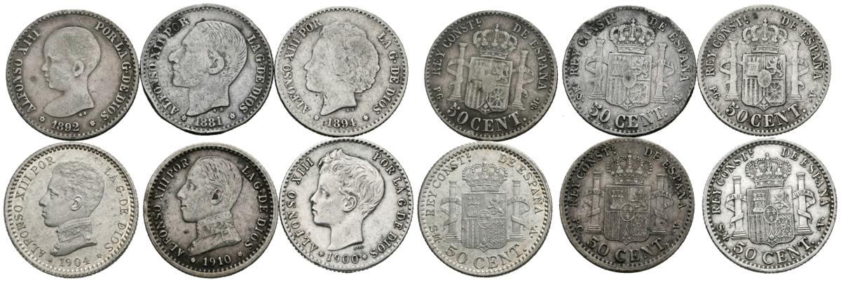 CENTENARIO DE LA PESETA. Bonita colección formada por 6 monedas de 50 Céntimos de Alfonso XII y Alfonso XIII. Ninguna pieza repetida. Diferentes estados de conservación. A EXAMINAR.
