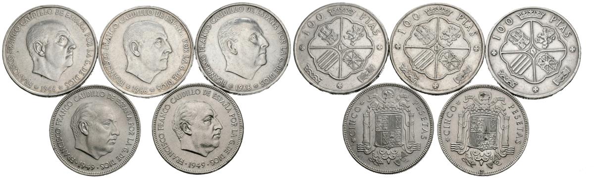 ESTADO ESPAÑOL. Interesante conjunto formado por 5 monedas, 3 de ellas de 100 Pesetas en plata de 1966 (*66, 67, 68) y 2 piezas de 5 Pesetas de 1949 (*49 y *50). Diferentes estados de conservación. A EXAMINAR.