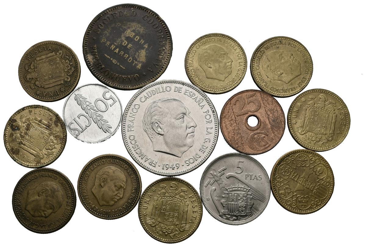 ESTADO ESPAÑOL. Bonito conjunto formado por 14 monedas, la mayoría en estado sin circular. Diferentes módulos, materiales y fechas. El conjunto incluye 25 Céntimos acuñados por la II República en 1938, 3 piezas de 1 Peseta de 1947 *54 y 56 y una ficha de 10 céntimos de Cooperativa de Pueblonuevo-Peñarroya. A EXAMINAR.