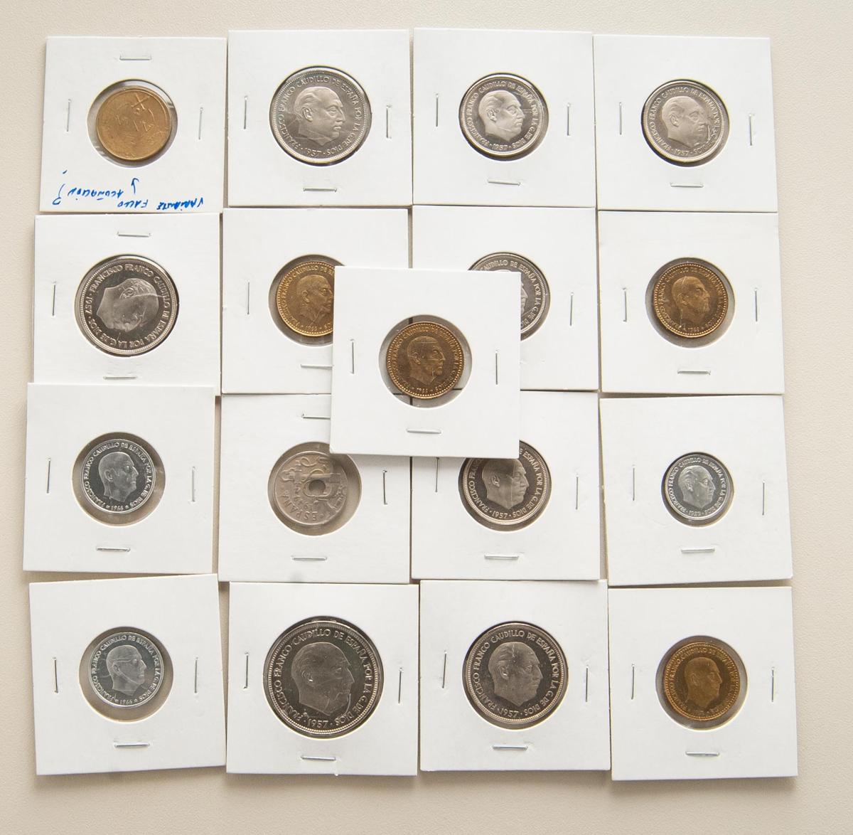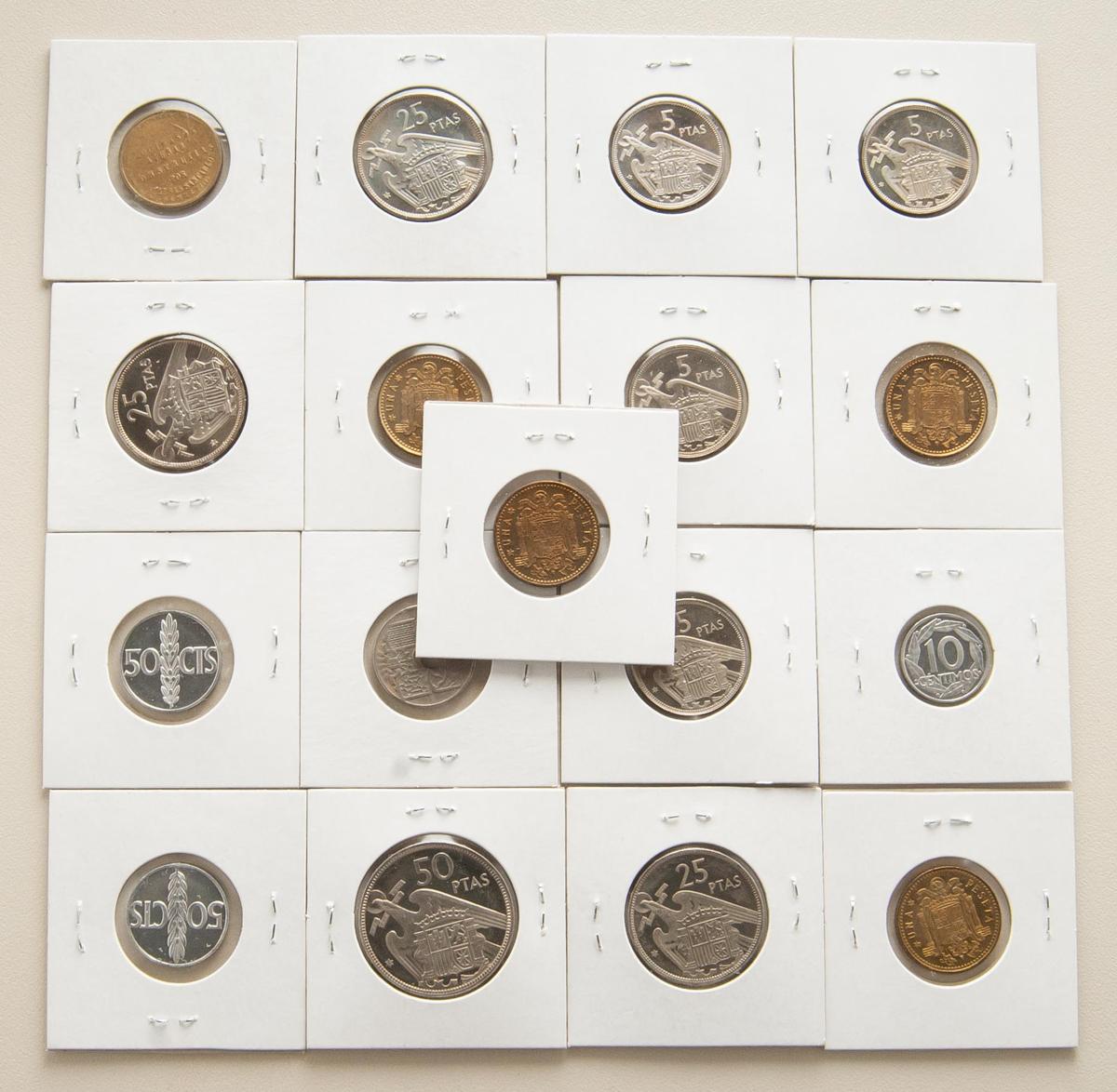 ESTADO ESPAÑOL. Conjunto formado por 17 monedas la gran mayoría de ellas en estado SC. Módulos diversos con valores comprendidos entre los 10 Céntimos y las 50 Pesetas. Incluye un ejemplar de la prueba de 1 Peseta de los Talleres San Carlos. A EXAMINAR.