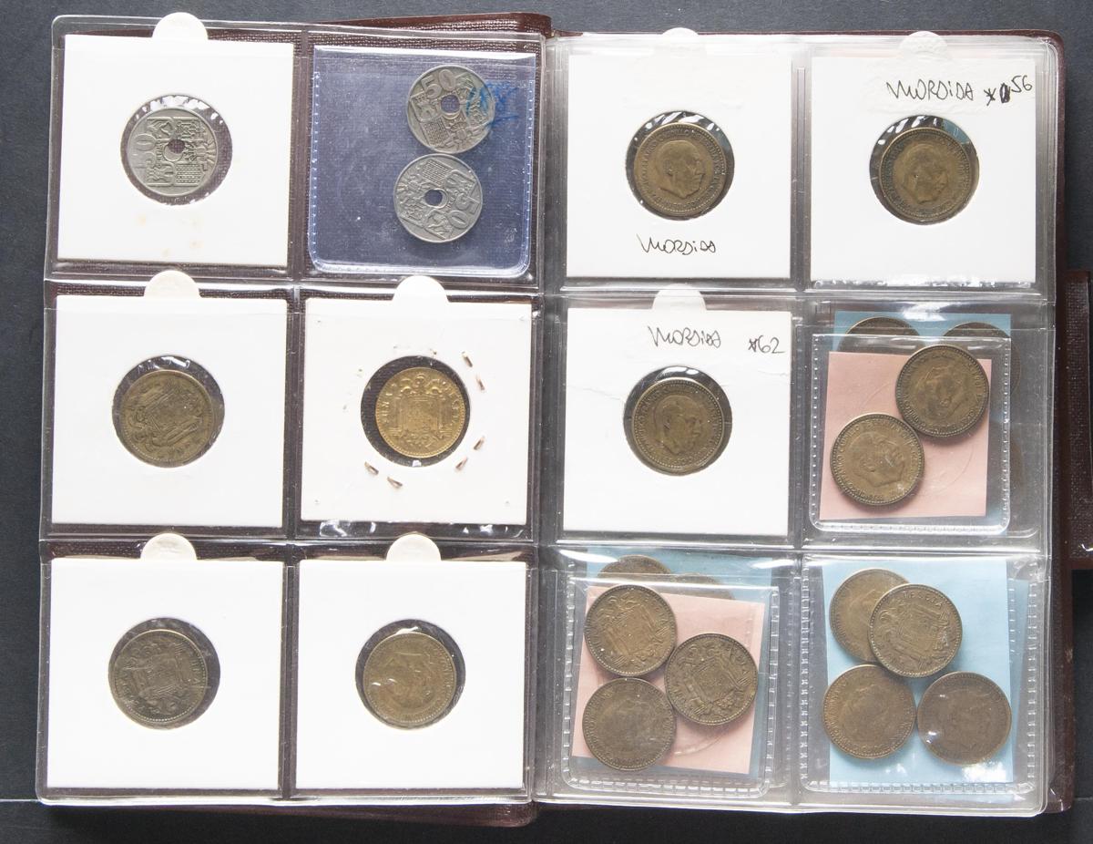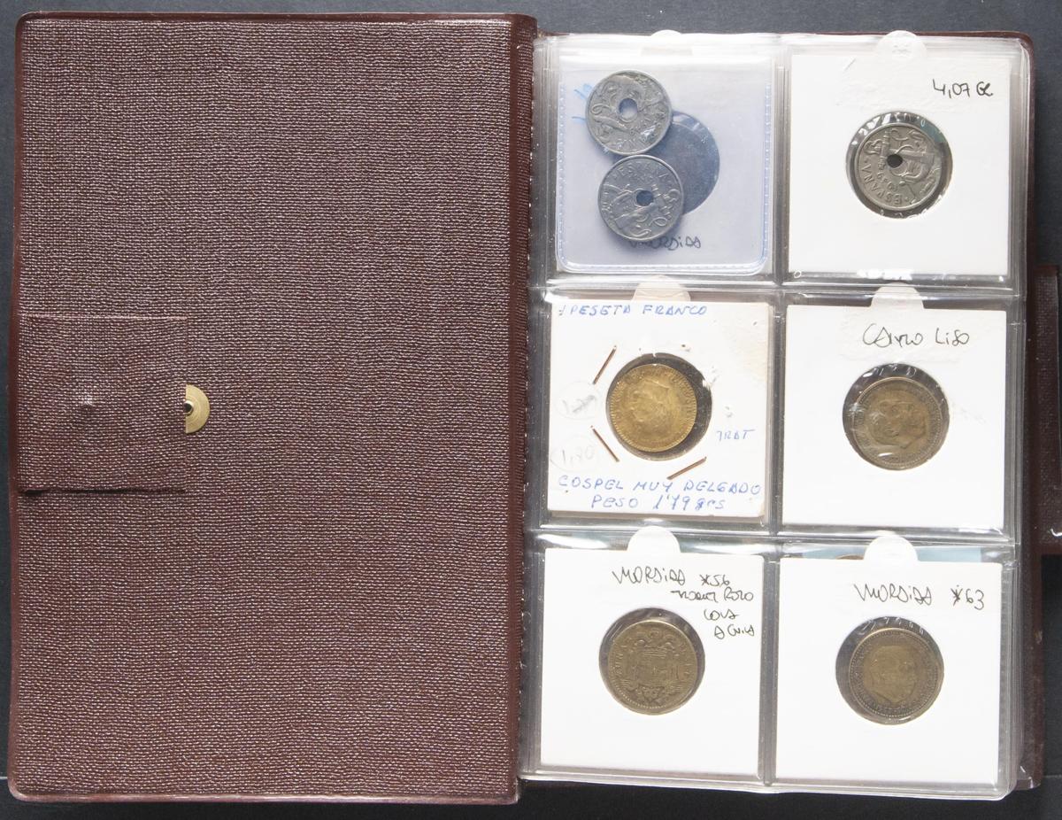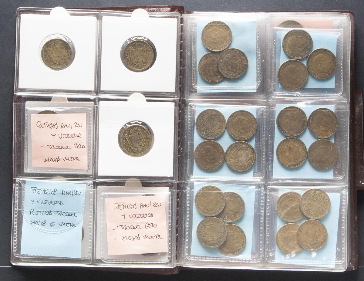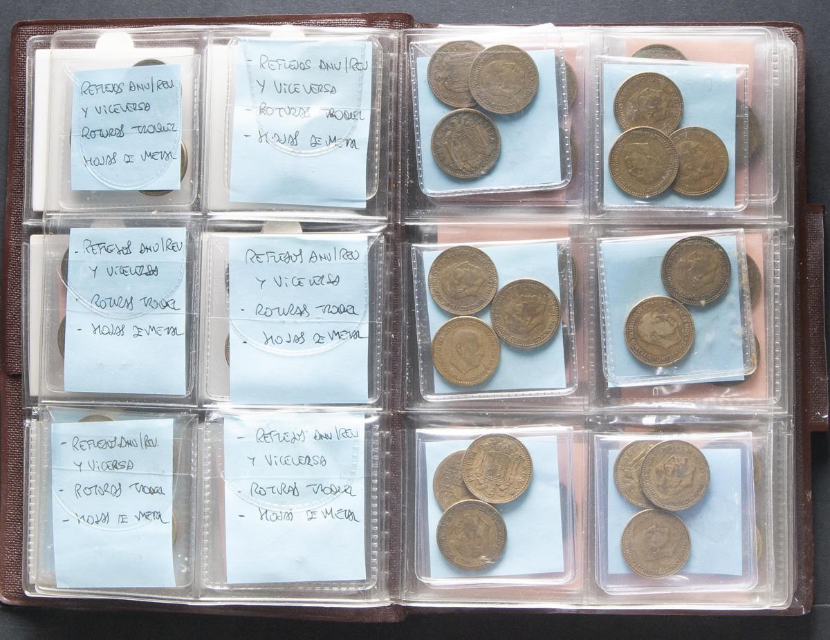 ESPAÑA. Colección formada por más de 250 monedas, principalmente del Estado Español, con variantes y errores de acuñación: reversos girados, cospeles segmentados, cospeles sin acuñar, dobles acuñaciones etc. El conjunto incluye 2 piezas de la prueba de 1 Peseta de la Naval. Diferentes estados de conservación. IMPRESCINDIBLE EXAMINAR.